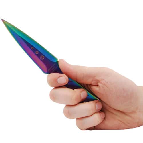 2 Piece Throwing Knife Plasma Color . 7.5″ Length, 2 Piece Set, made from 440 stainless steel, great beginner to intermediate throwing knife. Includes sheath pouch for knives.