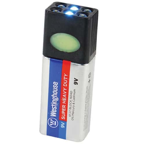The Blocklite instantly turns any 9-Volt battery into an LED flashlight. The Blocklite features an ultra-bright 6 LED flashlight with high and flashing light modes. Its compact design allows you to carry and store virtually anywhere.