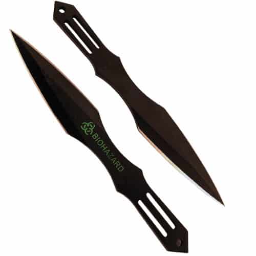 2 Piece Throwing Knife Black Color BioHazard. 5.5″ Length, 2 Piece Set, made from 440 stainless steel, great beginner to intermediate throwing knife. Includes sheath pouch for knives.
