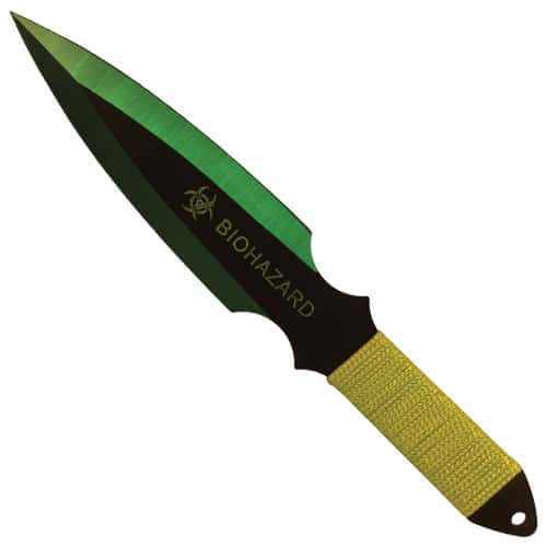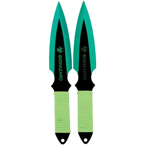 2 Piece Throwing Knife Green Color BioHazard. 9″ Length, 2 Piece Set, made from 440 stainless steel, great beginner to intermediate throwing knife. Includes sheath pouch for knives.